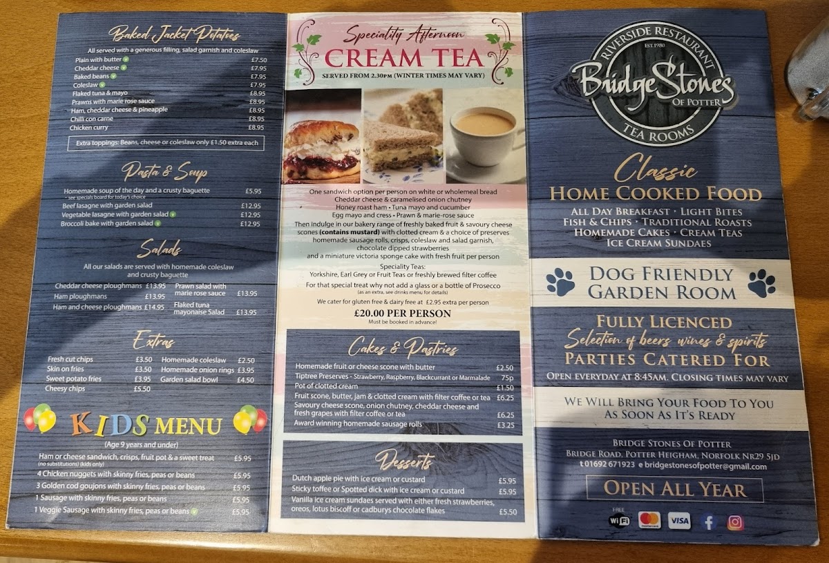 Welcome to BridgeStones of Potter, a charming café nestled on Bridge Road in Potter Heigham, Great Yarmouth. This delightful establishment captures the essence of a cozy, olde worlde ambiance, offering a warm escape with its quaint wooden tables and nostalgic decor.